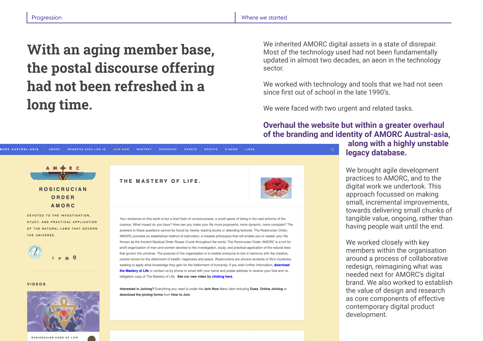 The Ancient and Mystical Order Rosae Crusis is a worldwide not-for-profit organisation, which engaged my team for a transition. This started out as a digital transition initially, however it evolved into an organisation-wide transition including strategic development throughout.